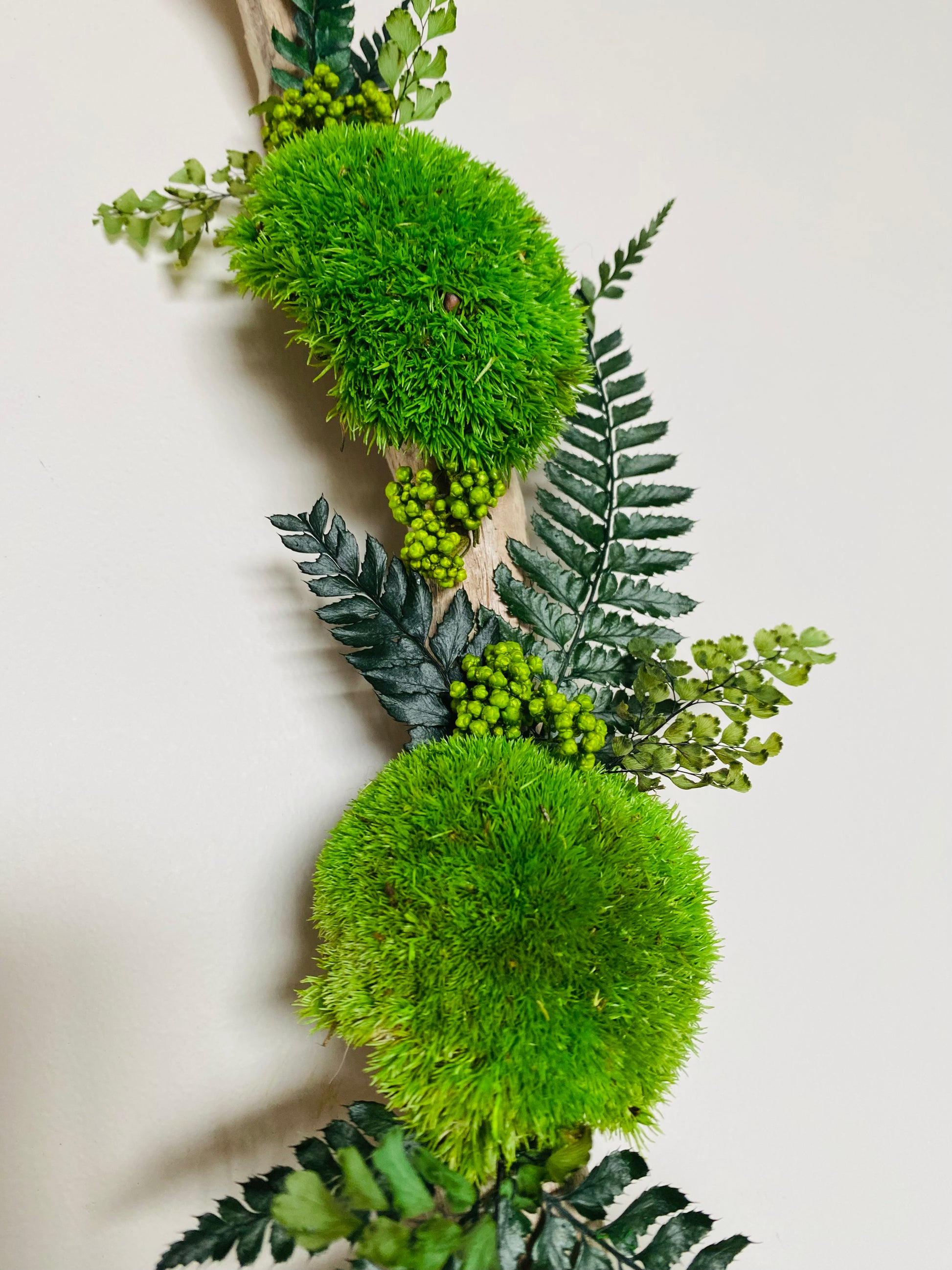 Chaque création est composée d’un bois flotté naturel, aux formes organiques et uniques, sublimé par une sélection de plantes stabilisées dans différentes nuances de vert.