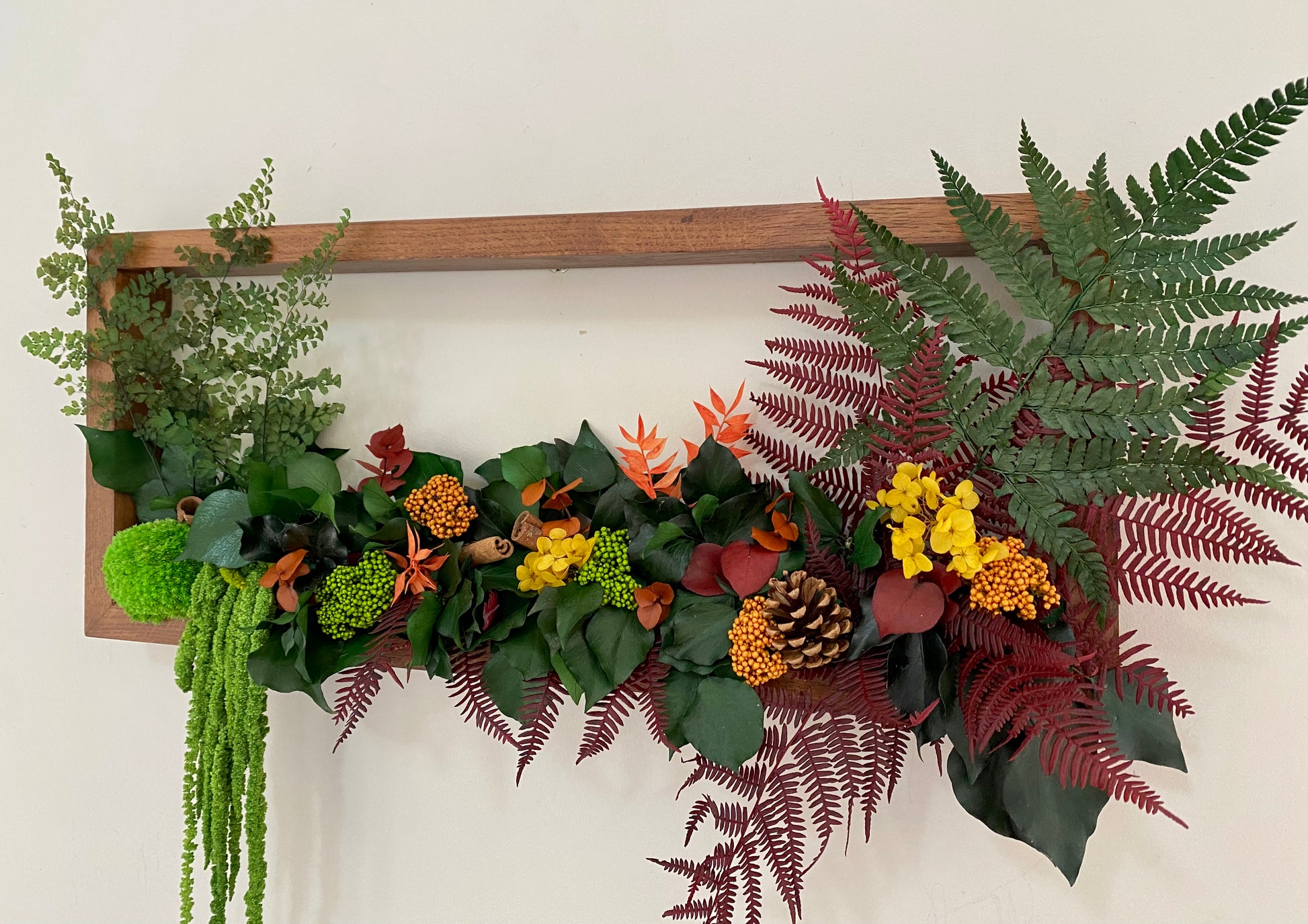 - 11 variétés différentes de plantes stabilisées : mousse boule, amarante, lierre, fougère verte & grenat, ruscus blanc & orange, capillaires, diosmi orange & vert, et lichens et 2 d'éléments séchés comme la cannelle ou la pomme de pin.